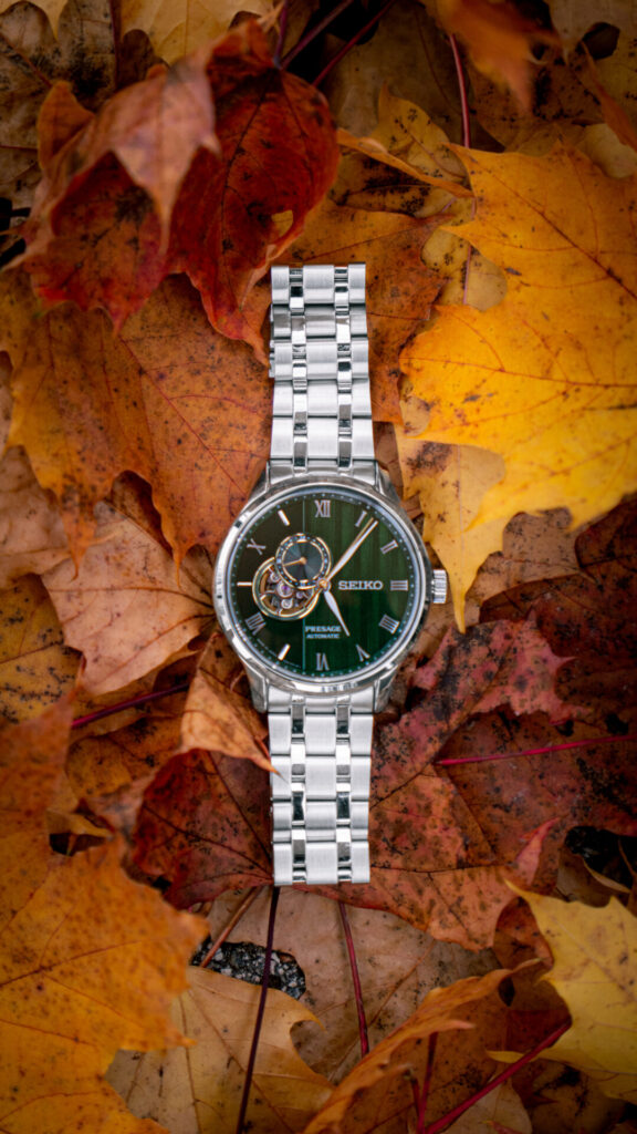 Zeit, die Blätter fallen zu lassen Uhren haben definitiv etwas Magisches an sich, das man selten findet. Unnachgiebig rattern und ticken sie vor sich hin, ihrem Besitzer stets treu ergeben. Sie sind in Momenten der höchsten Freude wie der tiefsten Trauer dabei. Erleben Wind und Wetter, Sonne, Meer und Berge. Hören Gelächter wie Stille und sehen Menschen kommen und gehen – teilweise über mehrere Generationen hinweg. Sie strahlen gerade in einer Welt wie heute eine unermüdliche Ruhe aus, während wir zwischen Displays, Pop-Up-Nachrichten und einer unaufhörlichen Informationsflut hin und her leben. Das tun sie, und vielleicht tun sie das nur deswegen, weil sie einfach nur die Zeit anzeigen – nicht mehr, nicht weniger. Obwohl die Zeit auf ihnen immerwährend voranschreitet, verleihen sie dem Leben einen Moment der Ruhe. Zeigen uns gleichzeitig auf, wie vergänglich alles ist. Lehren uns, dass Zeit das wichtigste Gut eines jeden Menschen ist. Eine Magie, die sich eben selten finden lässt. Auf den Bildern zu sehen ist die Seiko Presage Automatik. Untermalt wird sie in dieser Bildserie von den Farben des Herbstes, der uns wiederum daran erinnert, dass alles vergänglich ist, indem er die Blätter des Sommers zu Boden fallen lässt. Das offene Uhrwerk zeigt den unermüdlichen Drang der Uhr voranzuschreiten. Ohne Pause rattert es Tag und Nacht und wird umrandet von einem grünen Ziffernblatt, welches für so manchen Hoffnung ausstrahlen mag. Die silberne Hülle ummauert das empfindliche, pulsierende Innere und schützt es allumfassend. Etwaige Parallelen und Gedankensprünge dazu überlasse ich Ihnen.